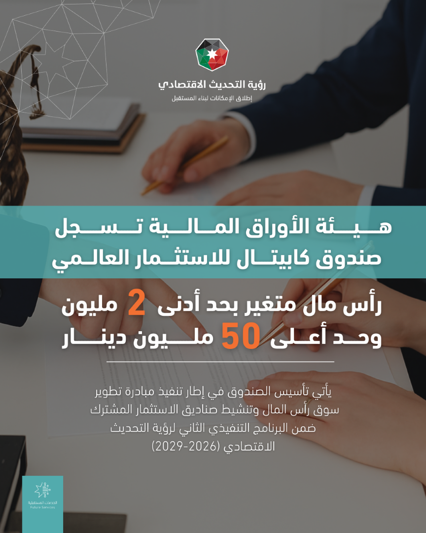 أعلنت هيئة الأوراق المالية الأردنية عن موافقة مجلس مفوضيها يوم الأربعاء الماضي، على تسجيل صندوق كابيتال للاستثمار العالمي الذي تم تأسيسه من قبل شركة المال الأردني للاستثمار والوساطة المالية.ويأتي تأسيس الصندوق في إطار تنفيذ مبادرة تطوير سوق رأس المال وتنشيطه، التي تُعد أحد المحاور الرئيسة في البرنامج التنفيذي الثاني لرؤية التحديث الاقتصادي (2026- 2029)، إذ يُعد مشروع إطلاق صناديق الاستثمار المشترك أحد المستهدفات الحكومية الهادفة إلى تعزيز عمق السوق وتوسيع المشاركة فيه، وتنويع الأدوات والمنتجات الاستثمارية.