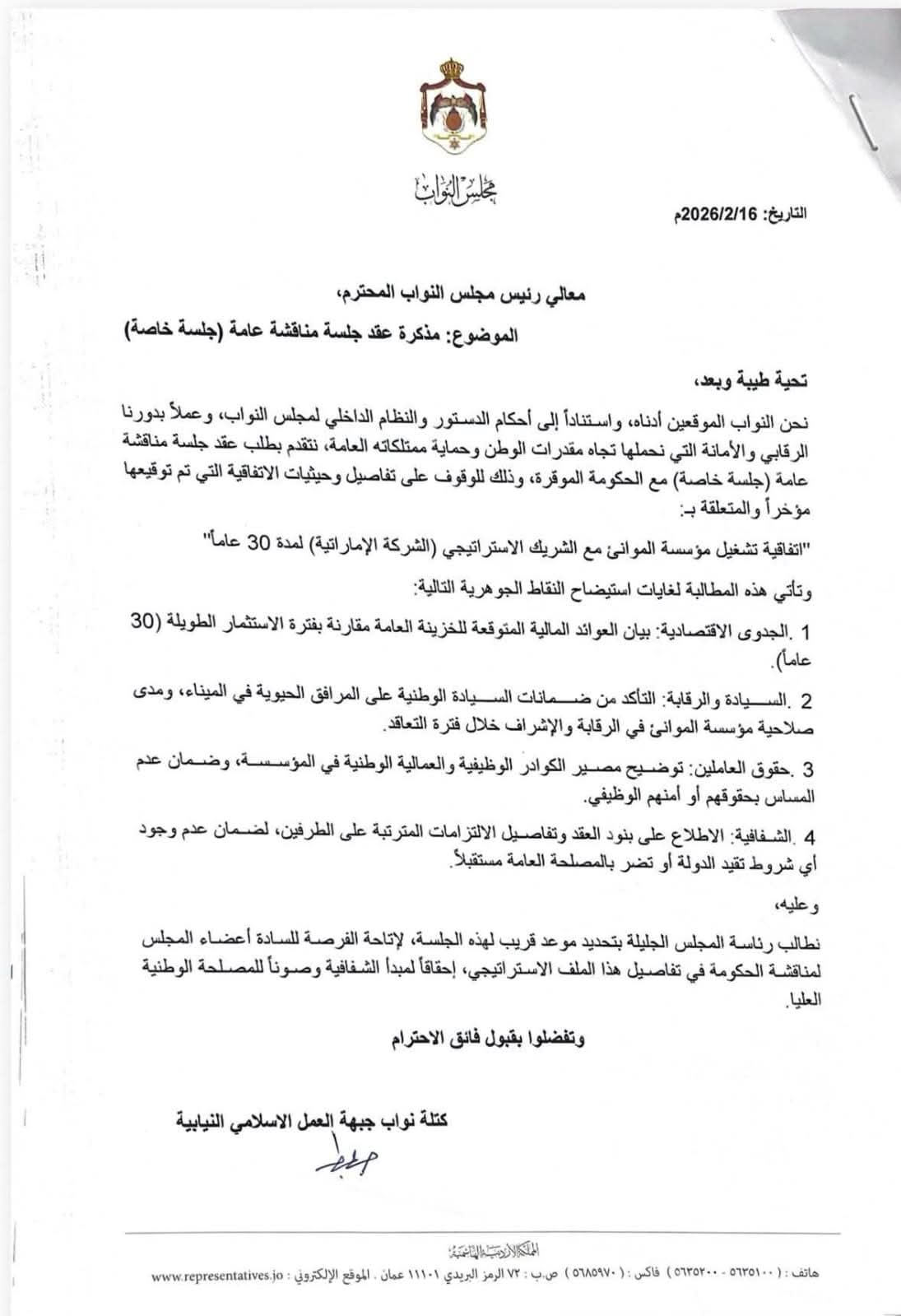 تقدمت كتلة جبهة العمل الإسلامي بمذكرة نيابية تطالب فيها بعقد جلسة خاصة مع الحكومة لمناقشة اتفاقية تشغيل مؤسسة الموانئ مع الشريك الاستراتيجي لمدة ثلاثين عامًا.ودعت الكتلة لبيان الجدوى الاقتصادية والعوائد المتوقعة والضمانات المتعلقة بالسيادة والرقابة، إضافة إلى توضيح مصير العاملين وإتاحة الاطلاع على بنود العقد تحقيقًا للشفافية والرقابة البرلمانية.وتالياً نص المذكرة :