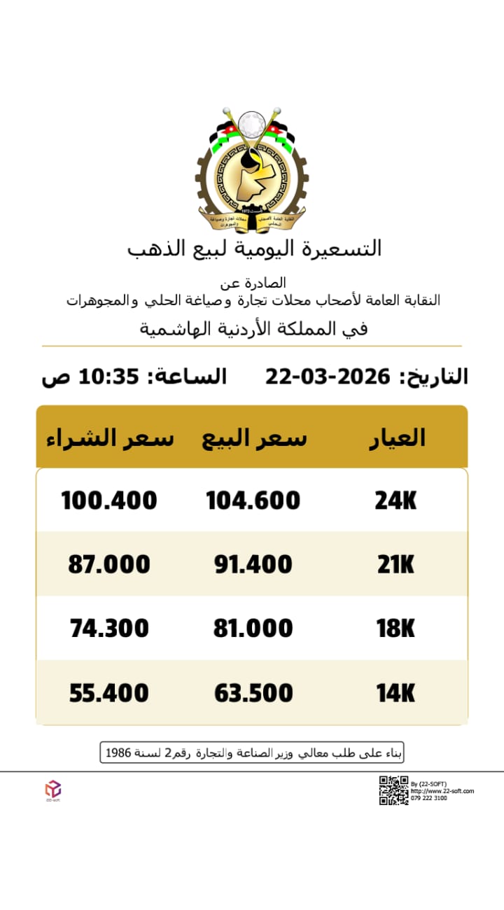 ووفق النقابة العامة لأصحاب محالّ تجارة وصياغة الحلي والمجوهرات، بلغت أسعار الغرام الواحد من الذهب عيارات 24 و18 و14 لغايات البيع من محالّ الصاغة عند 104.60 و81.00 و63.50 دينارا على الترتيب.