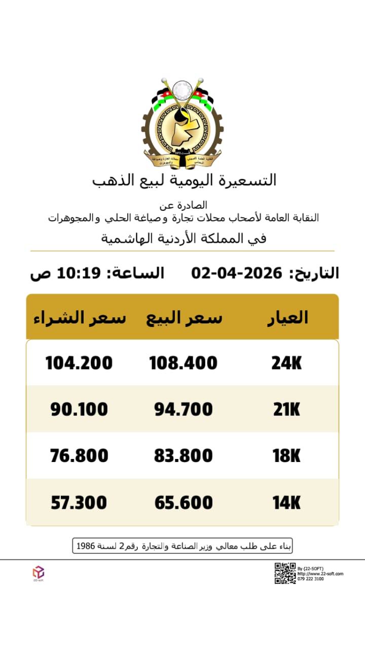 وحسب النشرة التي أصدرتها النقابة العامة لأصحاب محلات تجارة وصياغة الحلي والمجوهرات، بلغ سعر الغرام الواحد من الذهب عيارات 24 و18 و 14 لغايات البيع من محلات الصاغة عند 108.40 و 83.80 و 65.60 دينار على التوالي.