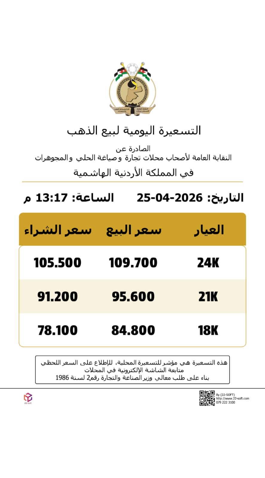 كما بلغ سعر بيع الغرام الواحد من الذهب عياري 24 و18 لغايات الشراء من محلات الصاغة 109.70 و84.80 دينارا على التوالي.