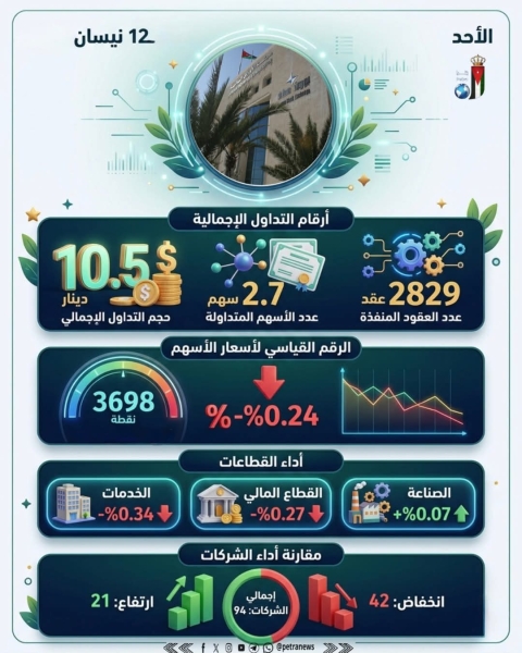 10.5 مليون دينار حجم التداول في بورصة عمان